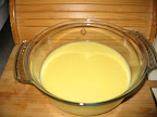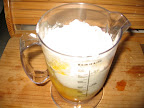 Una vez que quede todo batido, lo vierto en un recipiente, en este caso de cristal, umm tamaño suficiente para que no sobresalga el bizcocho y coja todo aquel ingrediente que he batido.